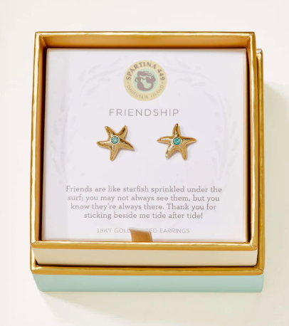 Wear our Friendship Earrings as a reminder that your friends are always there for you. Featuring starfish studs, these earrings come packaged inside a beautiful box with the message: "Friends are like starfish sprinkled under the surf; you may not always see them, but you know they’re always there. Thank you for sticking beside me tide aſter tide!"