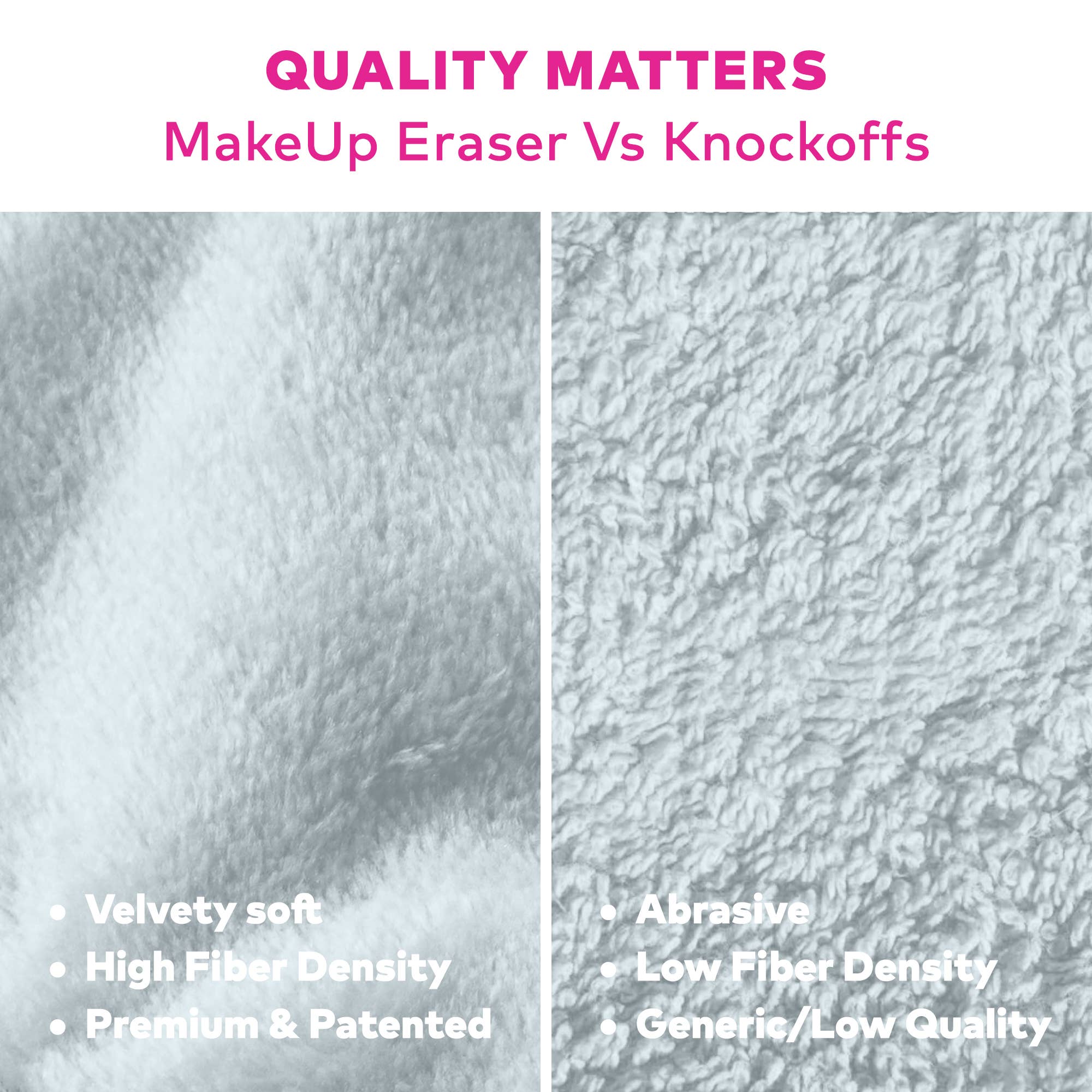 MakeUp Eraser is powered by SmartErase™ Technology, featuring unique cross-section microfibers engineered for efficient makeup removal using electrostatic forces, & enhanced when wet. This innovation also allows for easy stain removal with machine washing.