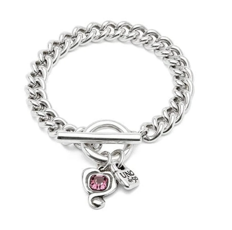 Silver Curb Link Chain Bracelet W/ Pink Crystal Heart Charm - Uno de 50
