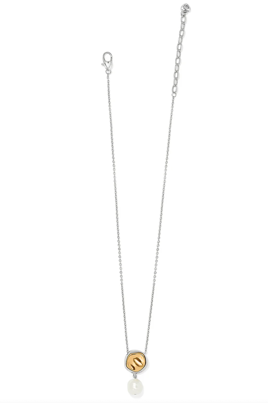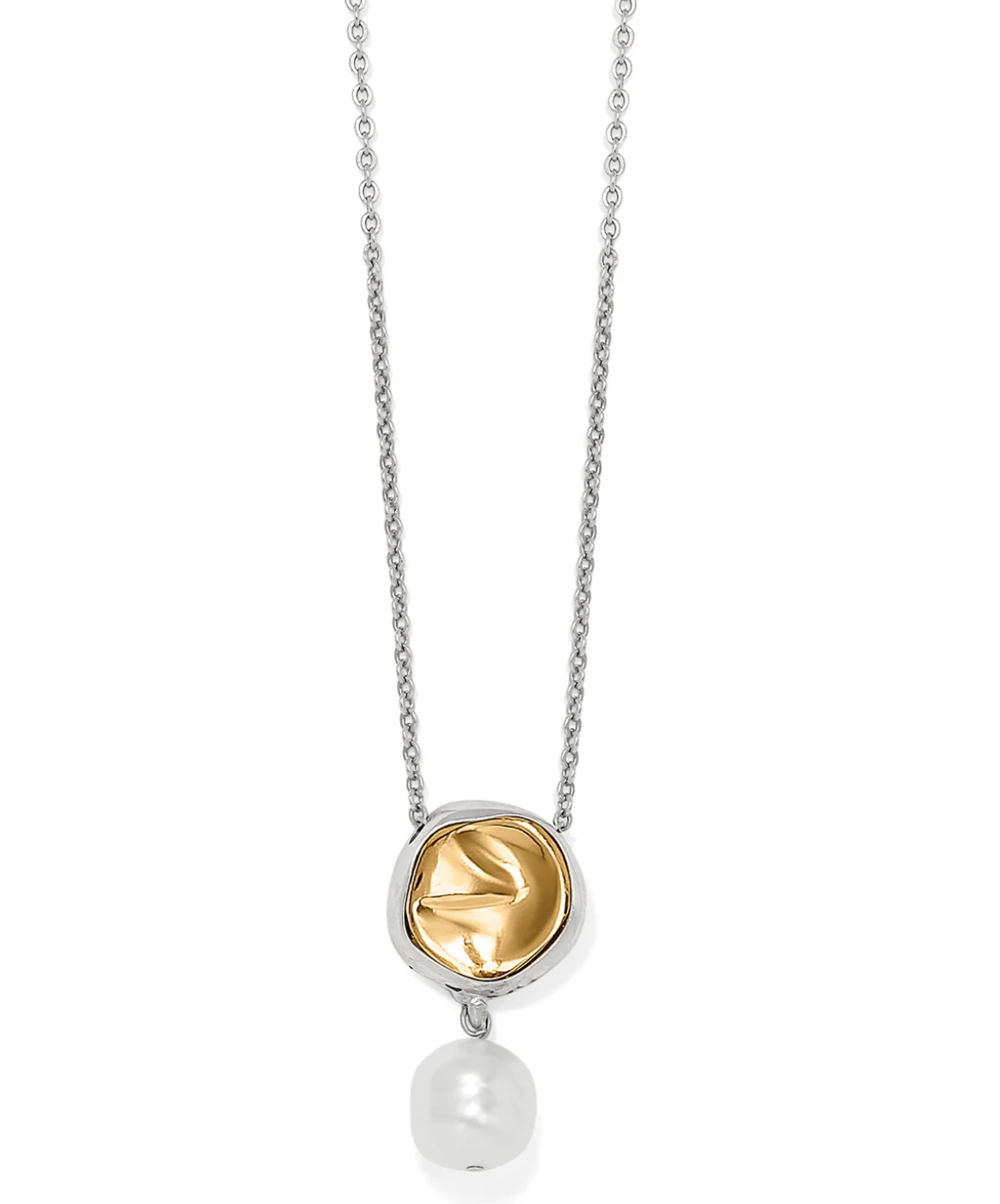 Inspired by modern metal sculptures and fluid automotive designs of the past, this petite necklace with golden and pearl accents is the perfect starting point to a sophisticated layered look, or looks great worn solo.