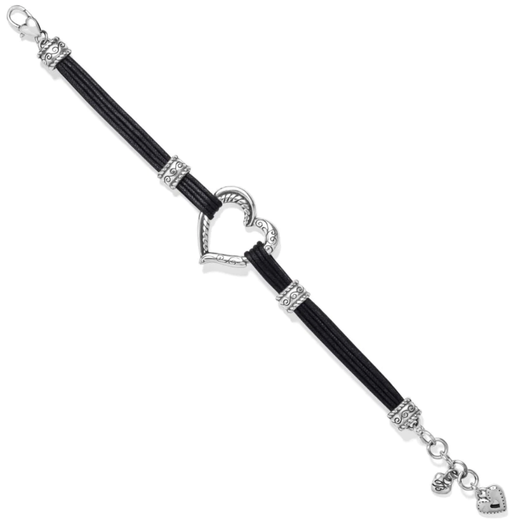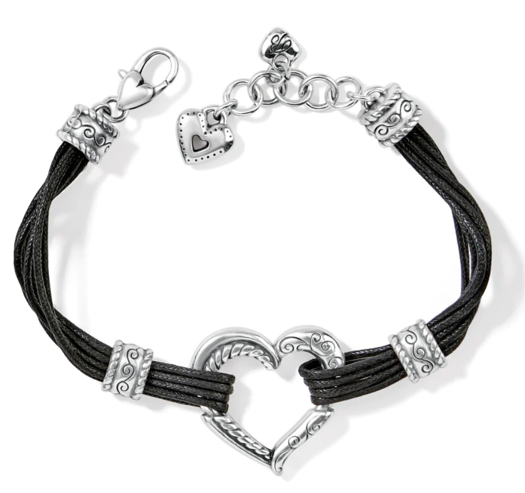 A bold sculptural heart is the centerpiece of this unmistakably Brighton bracelet flanked by supple cotton-corded strands on this comfortable-to-wear bracelet. The beauty of it is in the modern-at-heart shape and the artful scrolled details that give it elegance and grace.