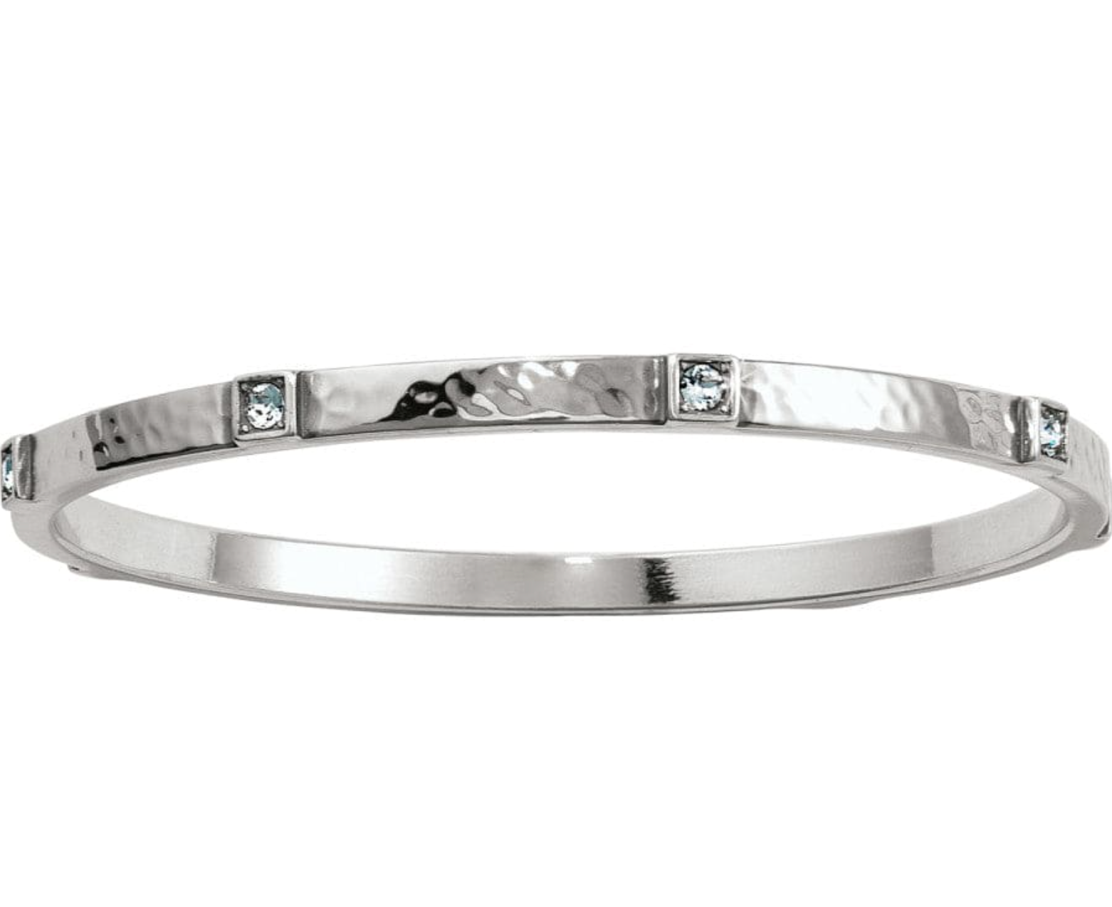 Slender and sleek, this hammered silver bangle shines, punctuated by stations of fine quality crystal in chic square frames. Great for stacking.