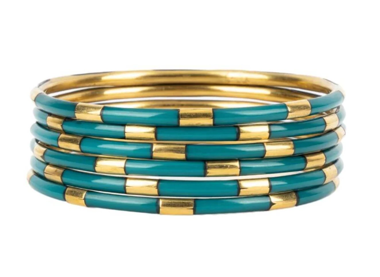 BuDhaGirl's Veda enamel and brass bangles have become a beloved choice for mixing and matching! Caribe is a color evocative of deep, clear lagoons.  Vedas are meticulously crafted bangles that feature exquisite enamel work in stunning colors, designed to complement our AWB® and enhance your wristscape. With their slim profile and feather-light feel, these six beautiful bangles are a joy to wear because they are so very combinable