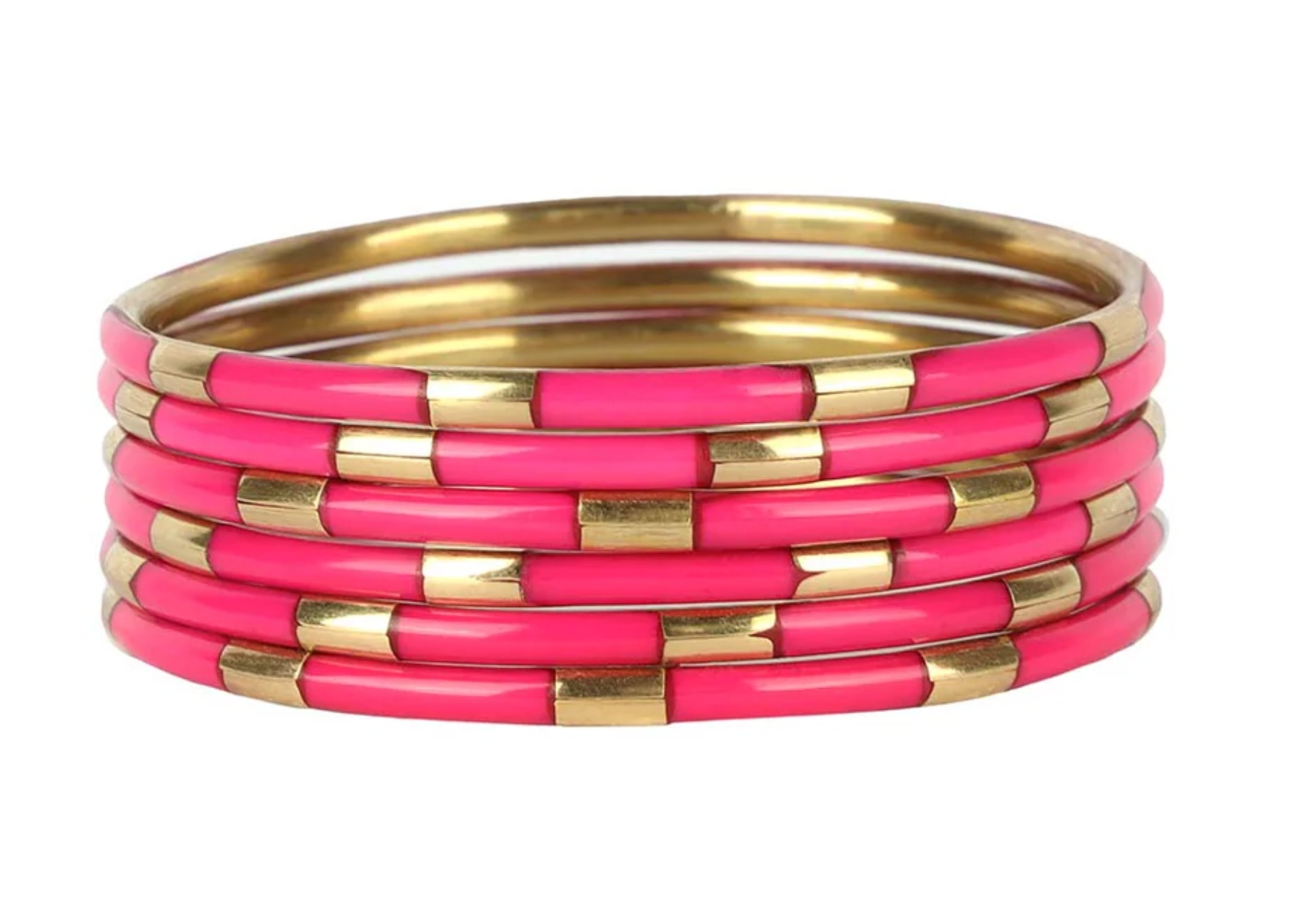 BuDhaGirl's Veda enamel and brass bangles have become a beloved choice for mixing and matching. No BuDhaGirl can be without fabulous pink! Vedas are meticulously crafted bangles that feature exquisite enamel work in stunning colors, designed to complement our AWB® and enhance your wristscape. With their slim profile and feather-light feel, these six beautiful bangles are a joy to wear because they are so very combinable