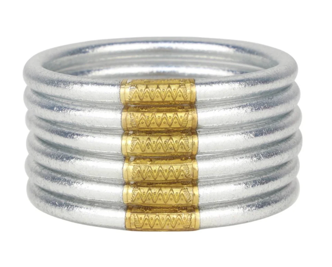 BuDhaGirl Silver All Weather Bangles® (AWB®), are the epitome of cool luxury in BuDhaGirl's impressive lifestyle collection. Our remarkable bangles redefine elegance with their weightless, soundless, waterproof, and TSA-proof design. Crafted to perfection, each set comprises six bangles, symbolizing intentions for the day. Wear them anywhere, as their soundless and waterproof nature ensures seamless integration into any setting.