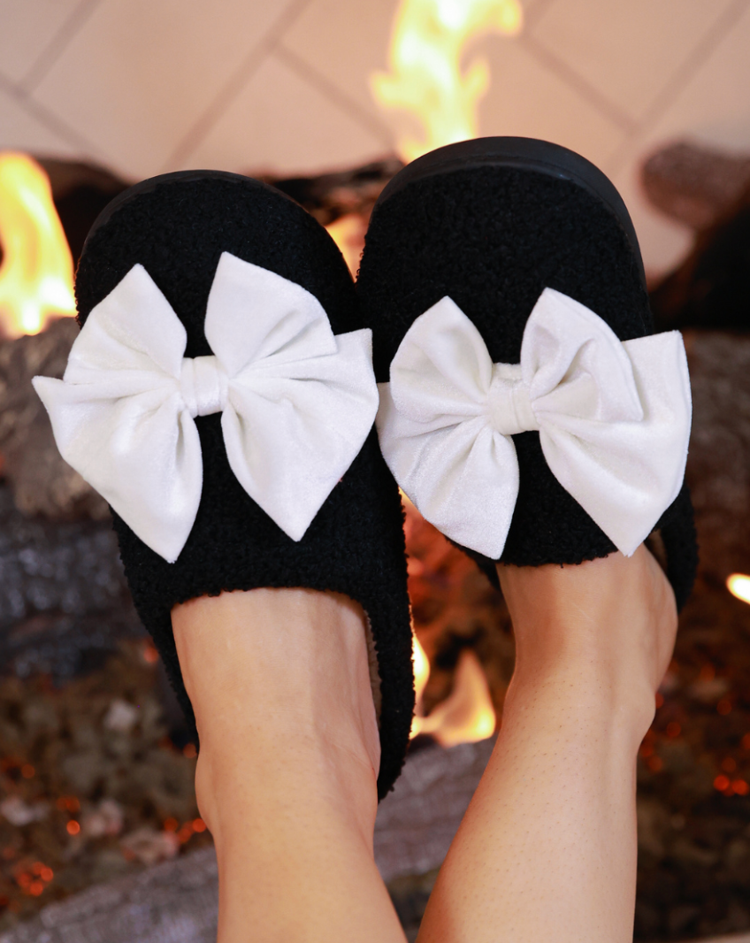 Black/White Cozy Bow Slippers