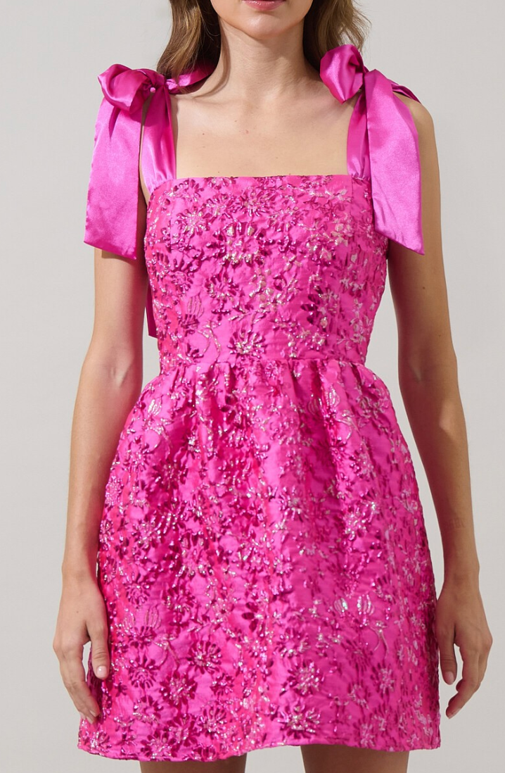Turn heads on date night in this shimmering Harrington Jacquard Nidia Mini Dress. The delicate pink jacquard fabric catches the light with every move, creating an effortlessly chic look that's equal parts sophisticated and flirty. Perfect for cocktail hours, dinner dates, or any occasion calling for a touch of glamour. This mini silhouette flatters and flows, making it your go-to dress for feeling confident and fabulous!