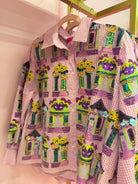 Reign supreme in this dazzling Mardi Gras button-up top that captures all the magic of the season. Featuring a stunning purple and white diamond pattern with eye-catching sparkles throughout, this chic piece brings festive glamour to any celebration. The playful design combines girly elegance with show-stopping shimmer, making you the true queen of the party. Perfect for Mardi Gras festivities, themed events, or whenever you want to add a touch of sparkly sophistication to your wardrobe. Dress it up or down for instant celebration vibes!