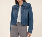 - Premium stretch denim adds comfort and laid-back appeal to this essential denim jacket in a classic wash.