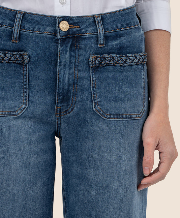 - These wide-leg jeans are a casual classic, designed to flatter every body type with soft, stretchy denim. Featuring raw hems and patch pockets with braided detailing, they provide a comfortable fit that gently shapes your silhouette.