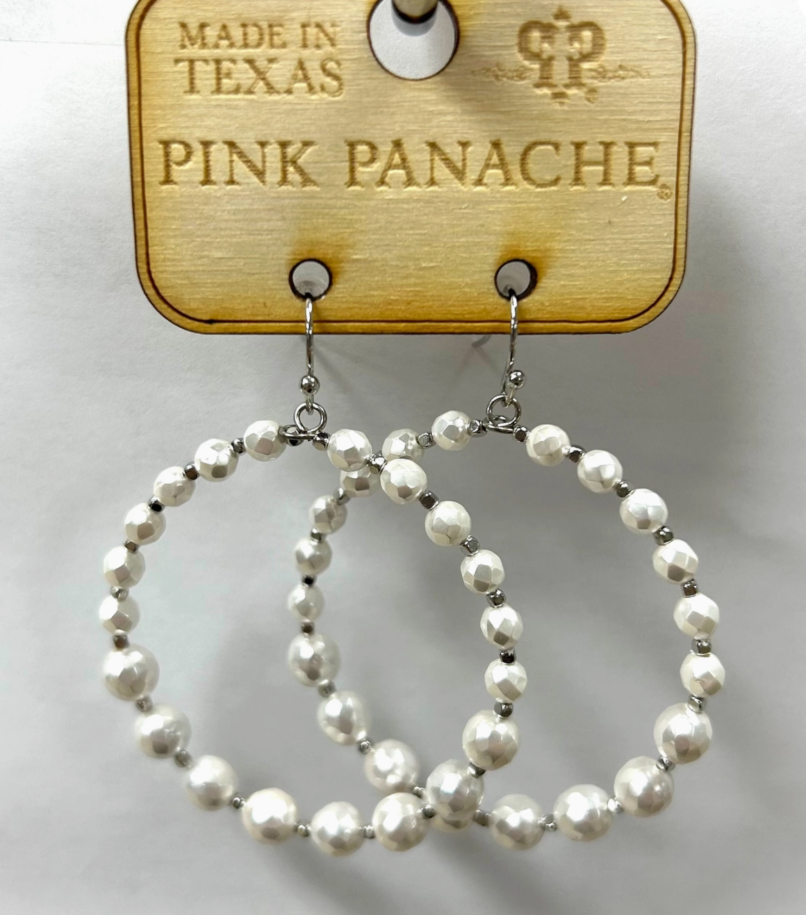 Silver and faceted pearl circle earring on french hook. Approximately 2 inches in length.