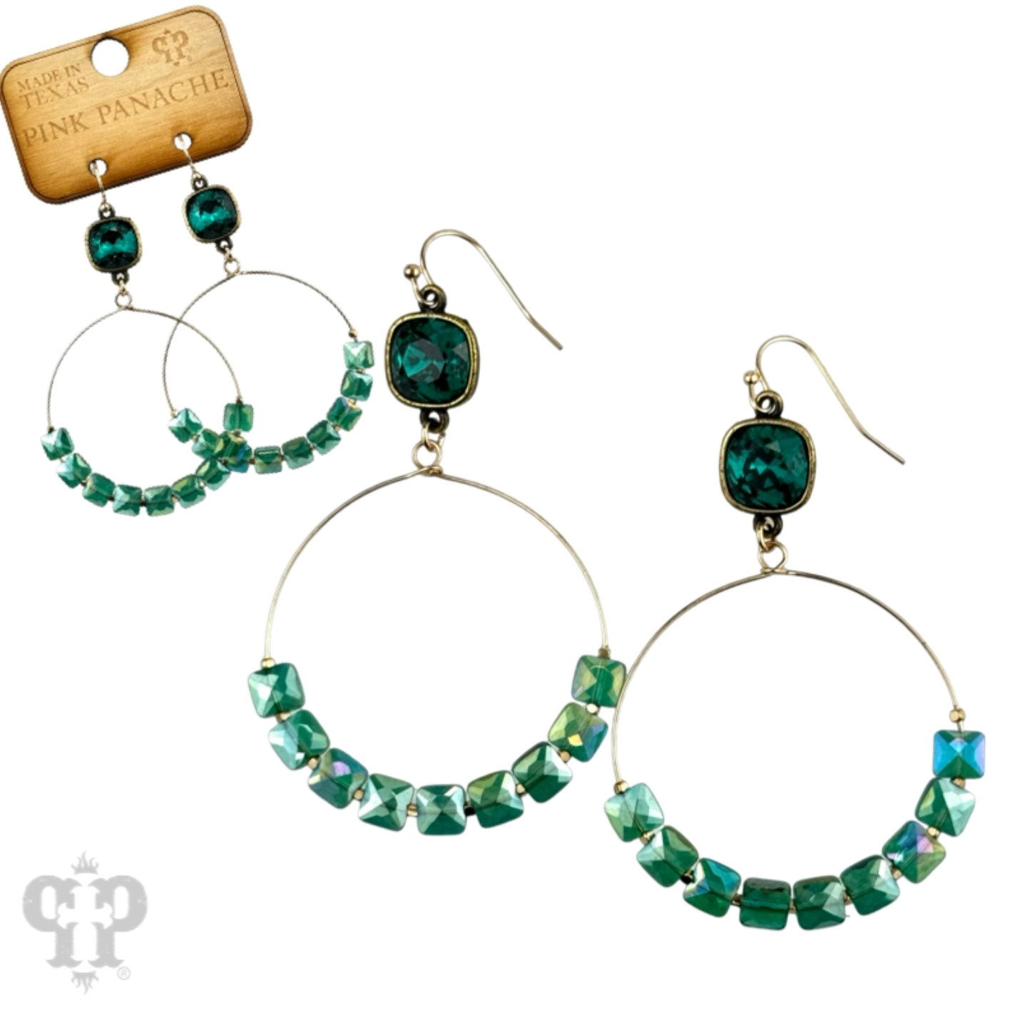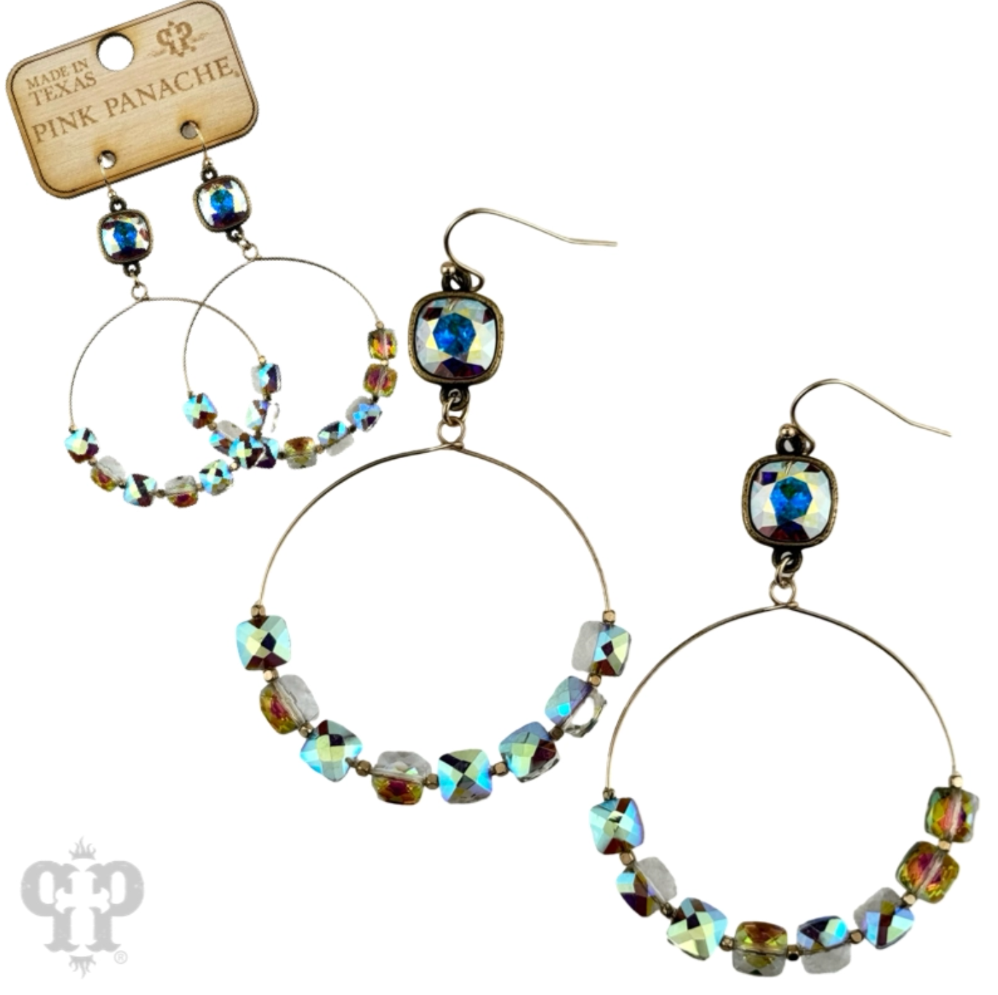 This earring has faceted flat square coin beads threaded onto a circle shape. It hangs from a 10mm Austrian crystal in a setting that was custom made for Pink Panache in the USA.