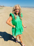 Bold, bright, and ready to be seen!! This vibrant green beauty features statement ruffle sleeves, delicate embroidered neckline detailing, and the sweetest flounce hem for extra movement and flair. She’s fun, flirty, and guaranteed to turn heads everywhere you go!! Perfect for brunch, showers, vacations, or any day you want to feel like the main character!!