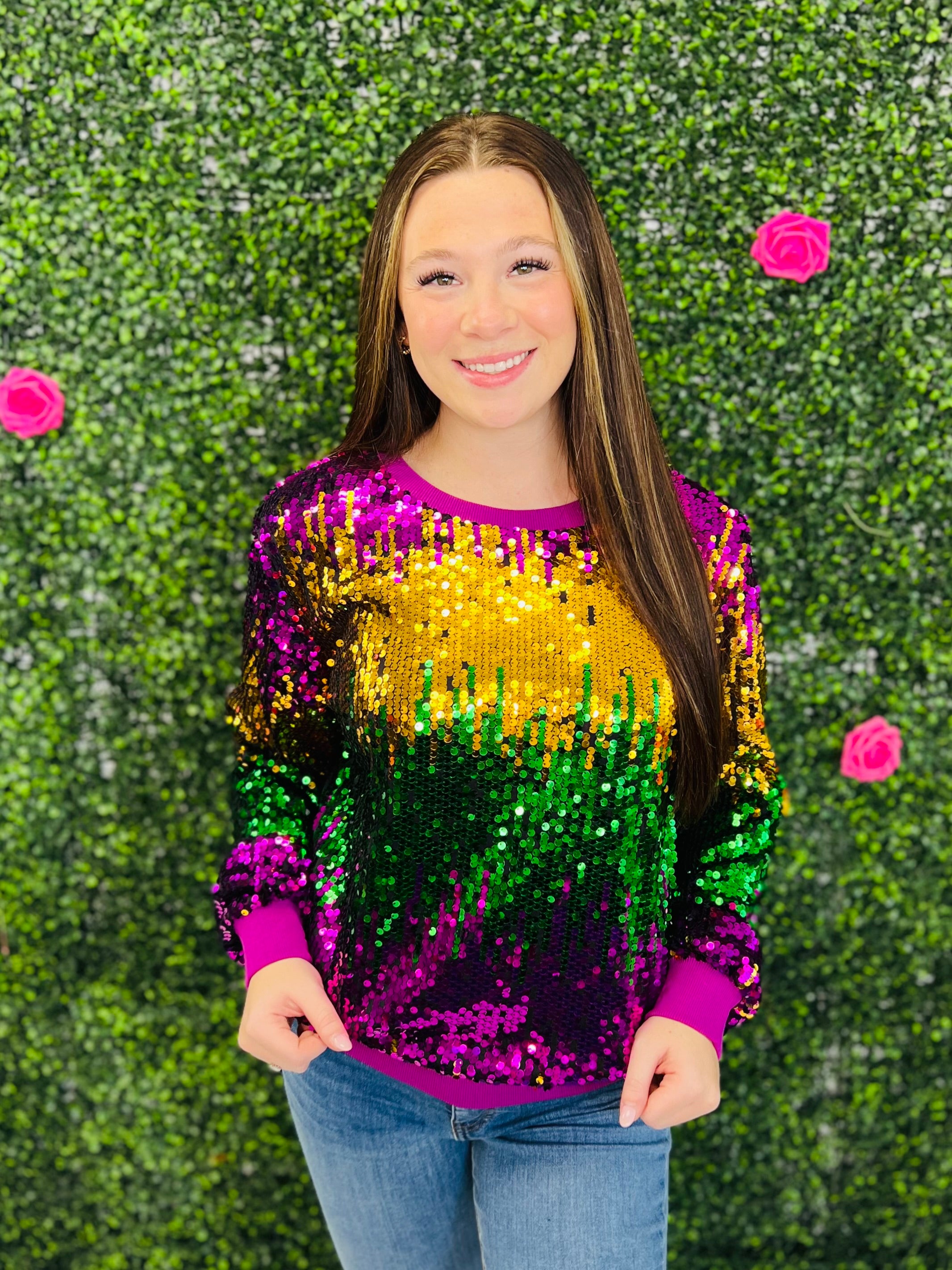 Bring the party to life with this vibrant sequin top that captures the spirit of celebration. Adorned with colorful sequins that catch the light with every move, it's the perfect piece for Mardi Gras festivities or any occasion calling for glamorous fun. The chic silhouette keeps things sophisticated while the playful sparkle ensures you'll turn heads. Whether you're dancing through the streets or celebrating in style, this festive essential transforms any moment into an unforgettable night!