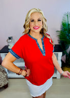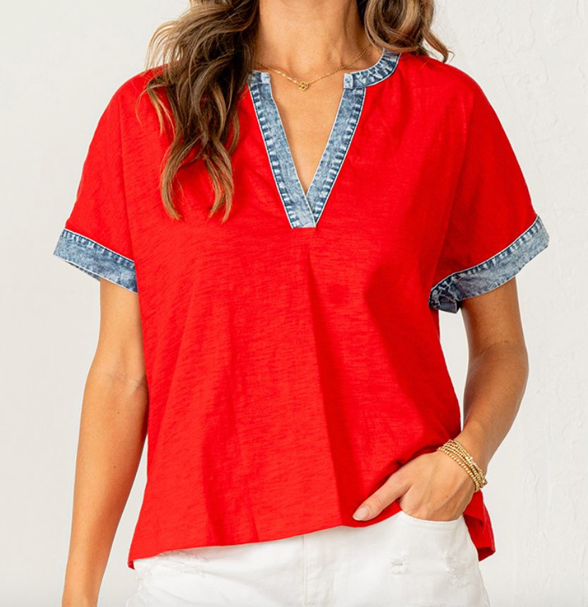 The Just My Style Top brings an easy, everyday look with a fun touch of contrast. Featuring denim trim accents, a flattering V-notch neckline, and a relaxed fit, this casual piece is both comfortable and stylish. Perfect for pairing with your favorite shorts or jeans, it’s an effortless go-to for laid-back days.