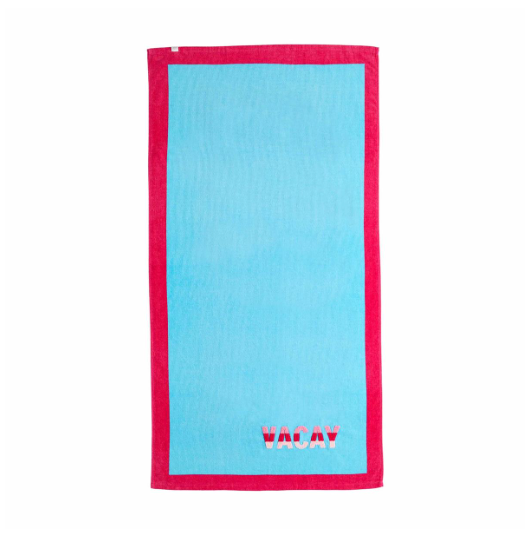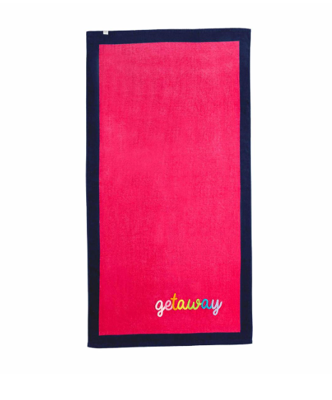 Terrycloth beach towel features boucle embroidered sentiment and contrast border.