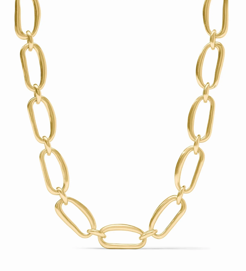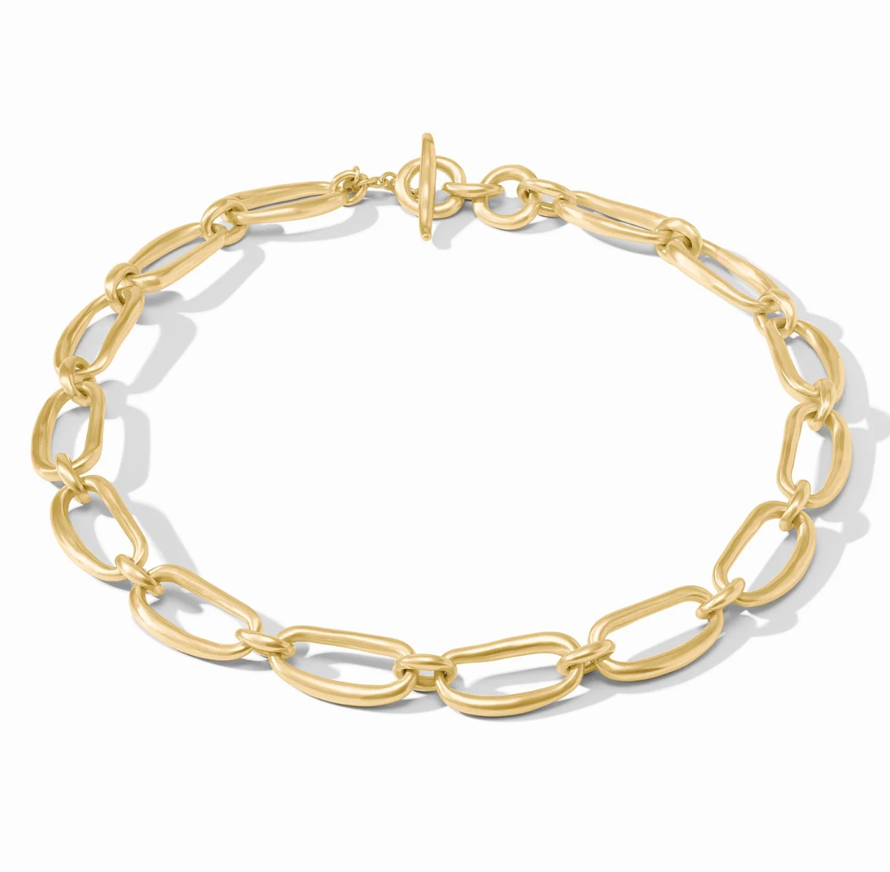 A necklace of undulating oblong links resembling hand-stretched golden rings, connected by curvaceous loops and featuring an adjustable toggle closure.
