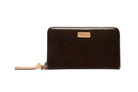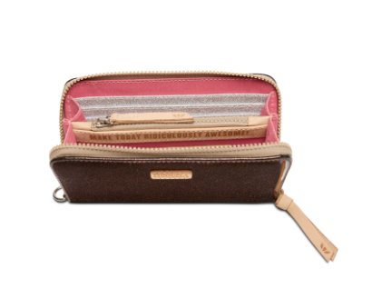 Function and versatility in the palm of your hand. Our new Essential Wallet is a streamlined,  large capacity wallet with tons of room for cards, cash, and receipts — plus a zippered center compartment for coins and keepsakes. We added a D-ring so you can easily clip it to any Consuela wristlet strap or anchor onto an inside lanyard for added security.