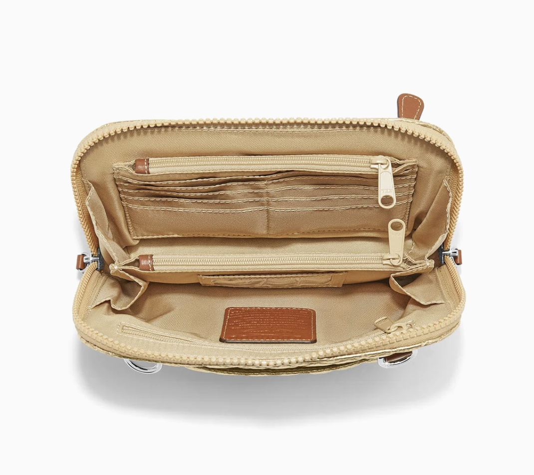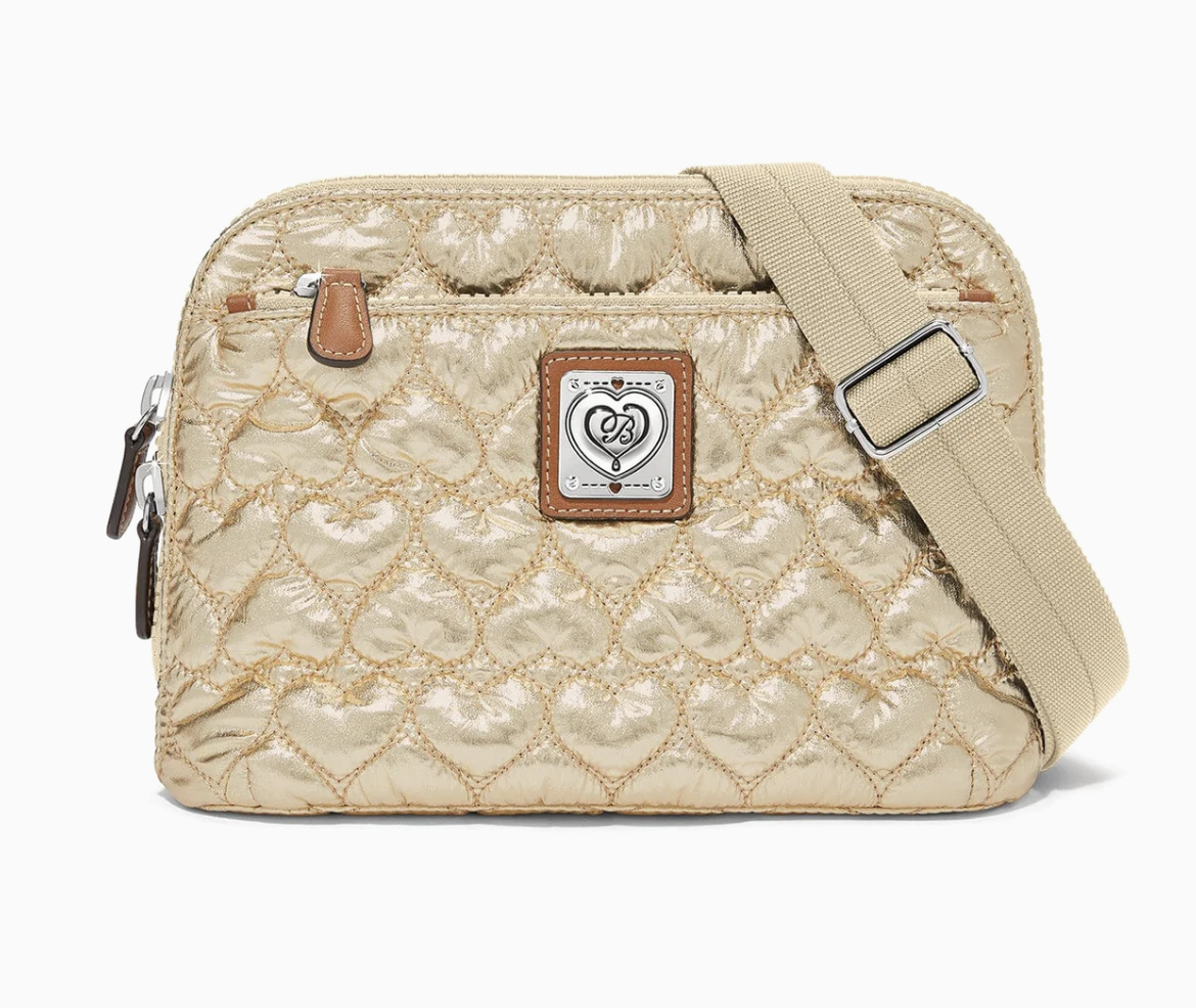 This featherweight that is quilted in heart-shaped nylon is adorable, rollable, packable and will bounce right back into shape. A secure ziptop, 2 exterior and 4 interior pockets and 8 credit card slots/ID window make it ultra-practical. It has a detachable/adjustable crossbody strap.