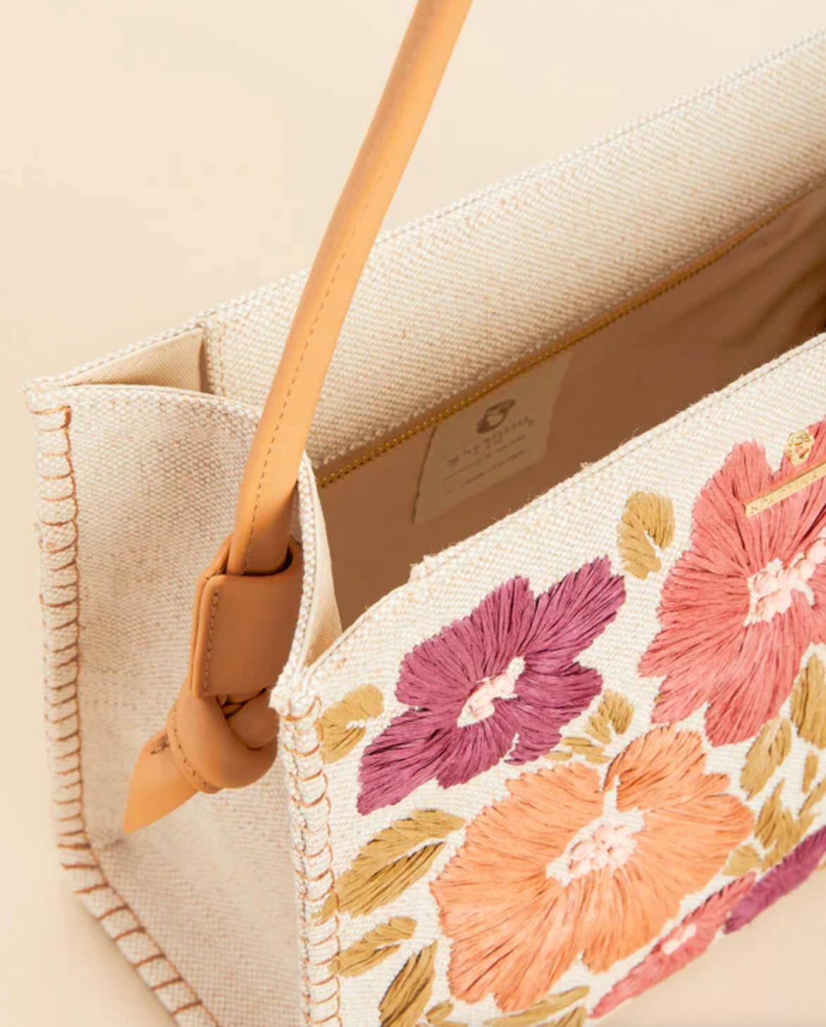 Made in a luxurious cotton and jute blend, our Raya Raffia Tote is embroidered in a vibrant raffia floral design to create a unique look only this intricate technique can provide. Inside its zipper top, you'll find 2 slip pockets and 1 zip pocket in this small size tote.