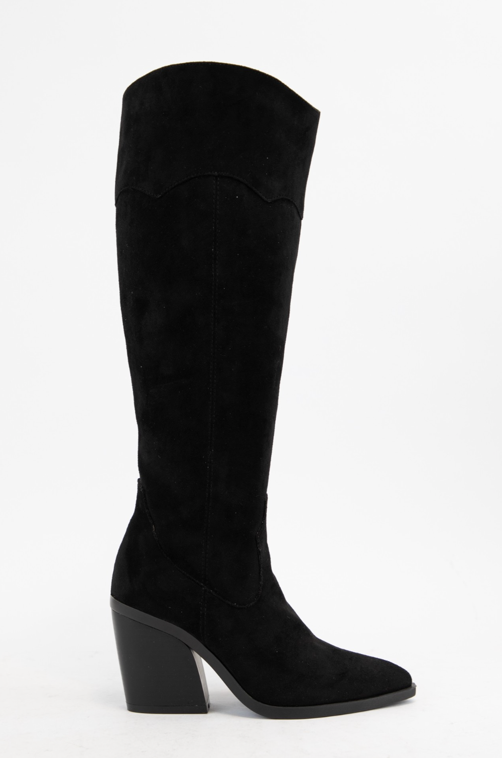 Step into timeless elegance with these sleek tall boots. They feature a classic pointed toe and are crafted from soft faux suede, creating a sophisticated silhouette. A comfortable stacked heel provides a subtle lift, perfect for all-day wear. The convenient half-zip closure on the inside allows for easy on and off.