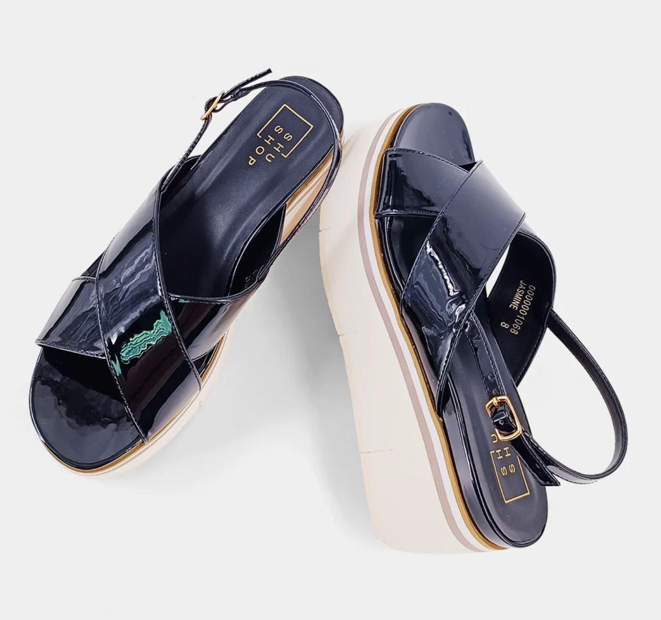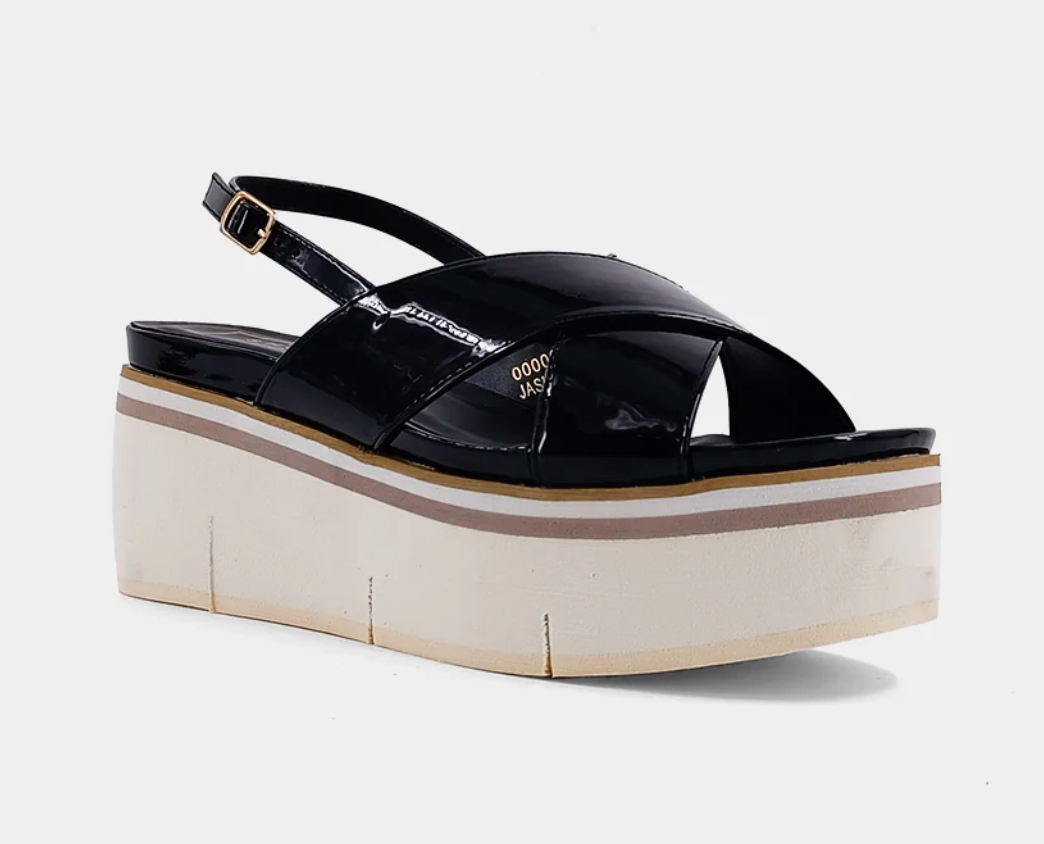 Introducing JASMINE - the epitome of chic footwear. Crafted with soft patent faux leather, this glamorous shoe boasts a unique design that turns heads. The criss-crossed strap ensures a secure fit, while the color-blocked platform soles add high fashion. Make a bold statement with JASMINE, whether you're dressing up or down.