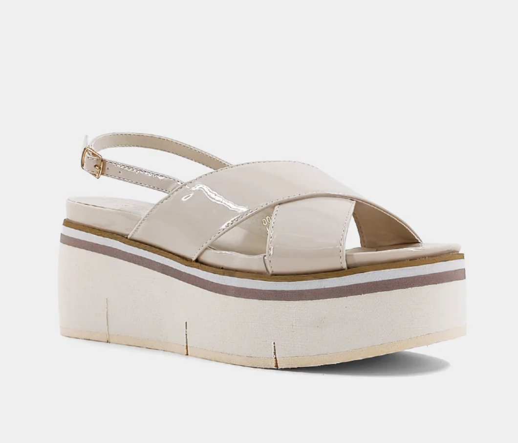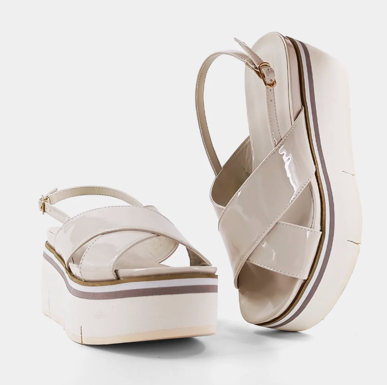 Introducing JASMINE - the epitome of chic footwear. Crafted with soft patent faux leather, this glamorous shoe boasts a unique design that turns heads. The criss-crossed strap ensures a secure fit, while the color-blocked platform soles add high fashion. Make a bold statement with JASMINE, whether you're dressing up or down.