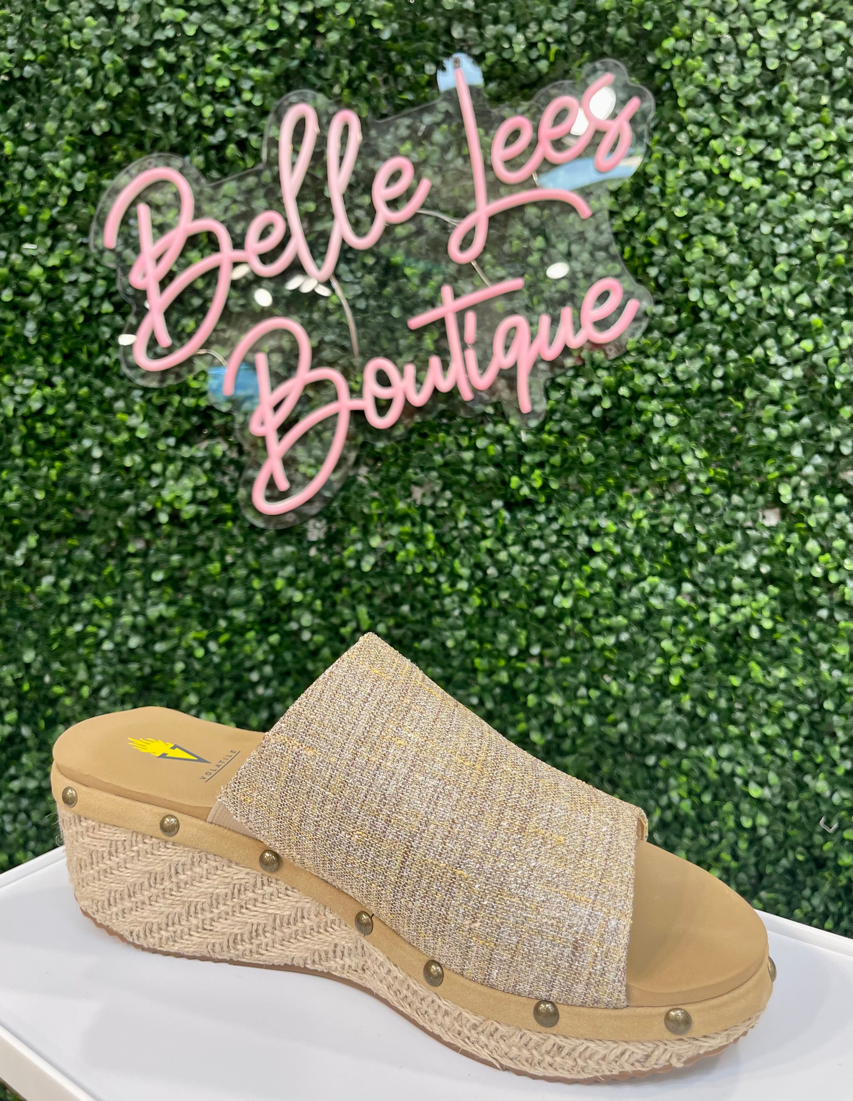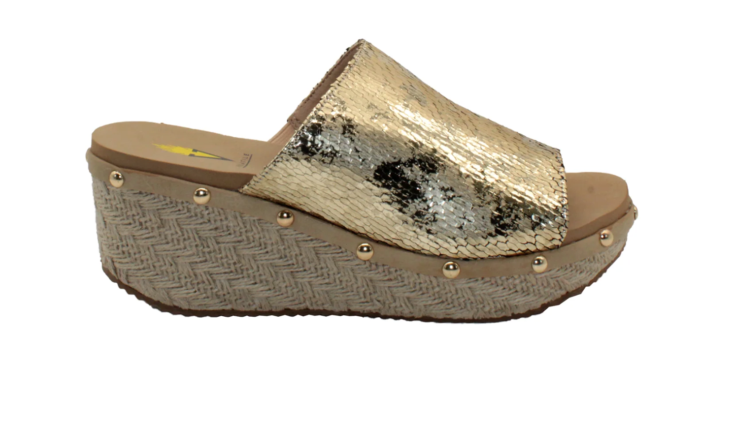Ravine is Volatile’s take on an espadrille sandal slide, and it is offered in metallic textile or metallic faux snake. We made it extra comfortable with our signature ultra-comfort EVA insole and added metal clogs studs for accent. The rubber traction outsole makes these ideal for outdoor excursions, consider packing these on your next vacation to wear from day into dusk.