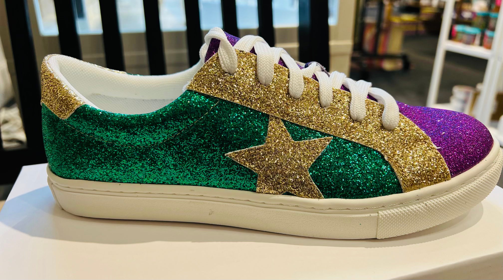 Multi-colored Glitter Color Block Sneakers with a Gold Star. These shoes are PERFECT for all your Mardi Gras festivities!!!