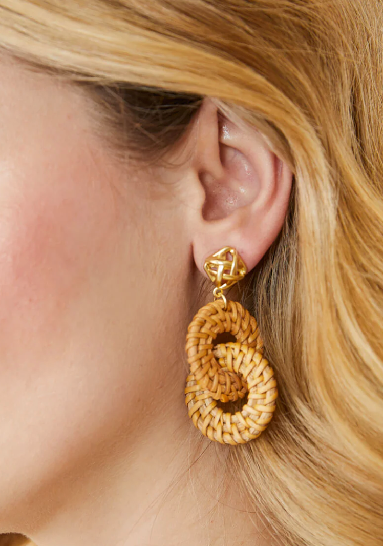 A woven cane pattern stud of 18kt matte gold plating tops lightweight woven wicker rings to create a one-of-a-kind look in our Cane Wicker Ring Earrings.
