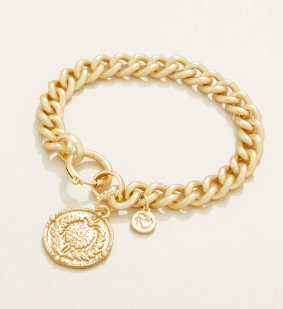 This vintage-inspired pendant features a golden damask pattern. Dangling from a thick chain and plated in 18kt matte gold, this bracelet is as unique as you.