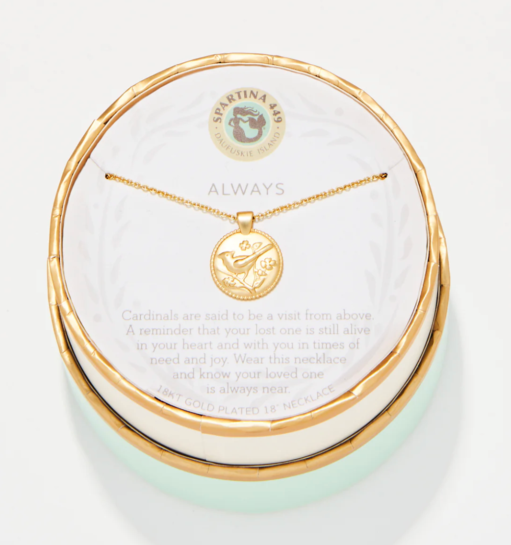 Wear our Always Necklace as a reminder that your loved ones are always with you. Featuring a cardinal charm, this special piece comes packaged inside a beautiful box with the message: "Cardinals are said to be a visit from above. A reminder that your lost one is still alive in your heart and with you in times of need and joy. Wear this necklace and know your loved one is always near."