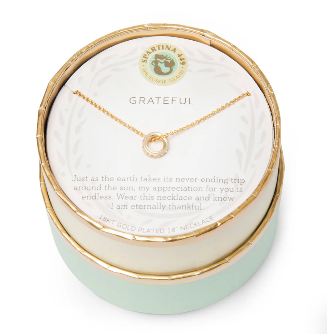 Wear our Grateful Necklace as a reminder of appreciation. Featuring a ring charm, this special piece comes packaged inside a beautiful box with the message: "Just as the earth takes its never-ending trip around the sun, my appreciation for you is endless. Wear this necklace and know I am eternally thankful."