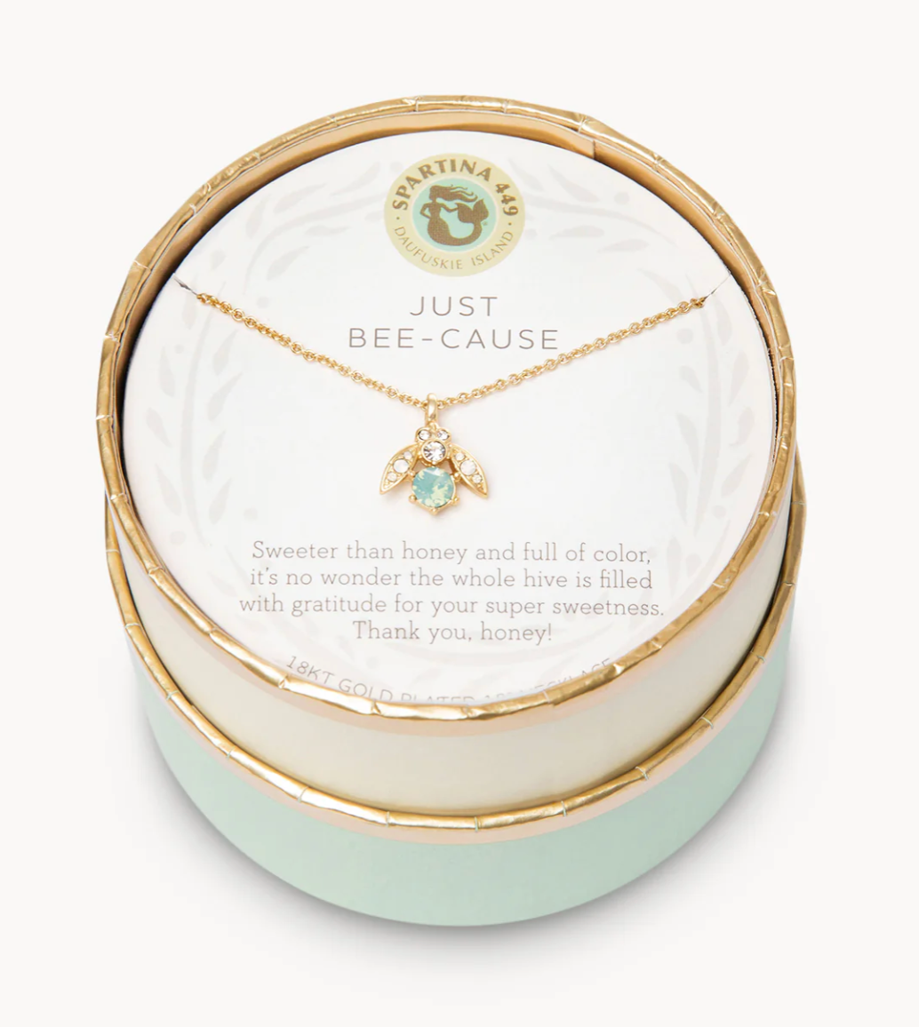 Wear our Just Bee-cause Necklace as a reminder to love through faith. Featuring a bee charm, this special piece comes packaged inside a beautiful box with the message: "Sweeter than honey and full of color, It's no wonder the whole hive is filled with gratitude for your super sweetness. Thank you, honey!"