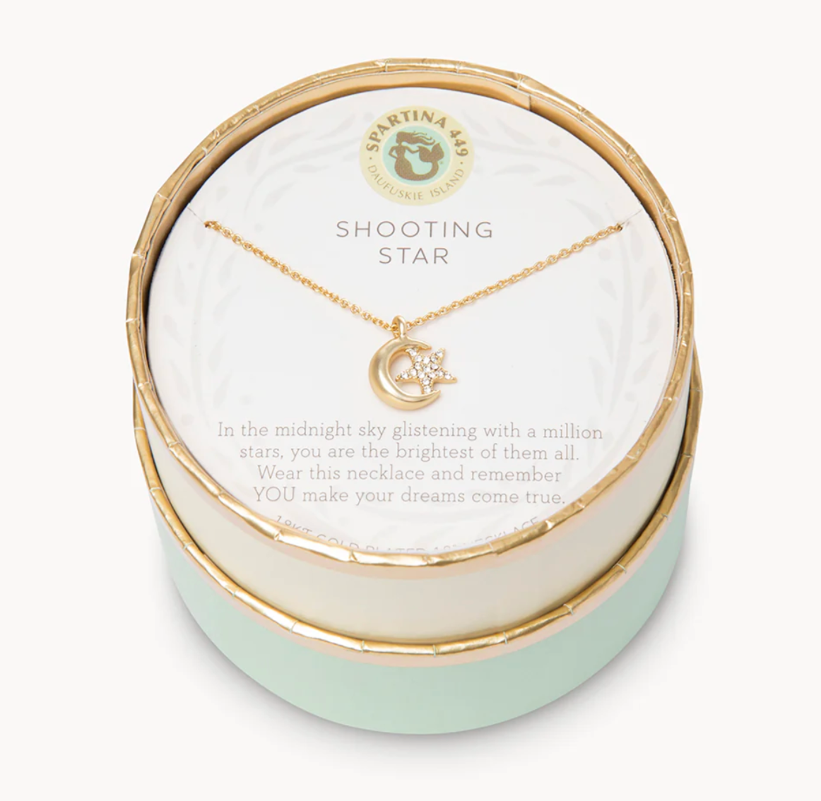 Wear our Shooting Star Necklace as a reminder to make your dreams come true. Featuring a moon star charm, this special piece comes packaged inside a beautiful box with the message: "In the midnight sky glistening with a million stars, you are the brightest of them all. Wear this necklace and remember YOU make your dreams come true."