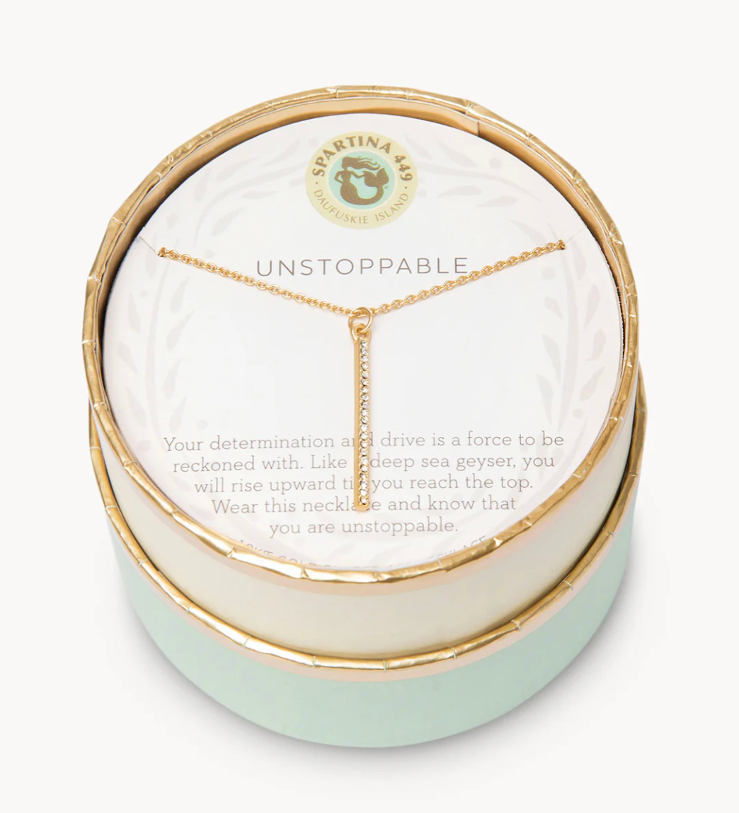 Wear our Unstoppable Necklace as a reminder to keep going. Featuring a vertical bar charm, this special piece comes packaged inside a beautiful box with the message: "Your determination and drive is a force to be reckoned with. Like a deep sea geyser, you will rise upward till you reach the top. Wear this necklace and know that you are unstoppable."