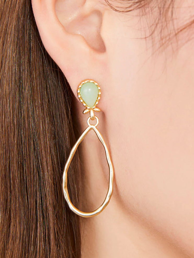 Our Nara Teardrop Earrings features a jade stone intricately framed in 18kt gold plated scallops with lightweight textured hoops dangling below. The perfect complement to your style, all year long.