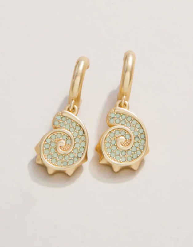 The ocean calls to you in our Nautilus Drop Earrings. These drop earrings feature a 18kt matte gold plated hoops with sea foam gem encrusted seashell charms.