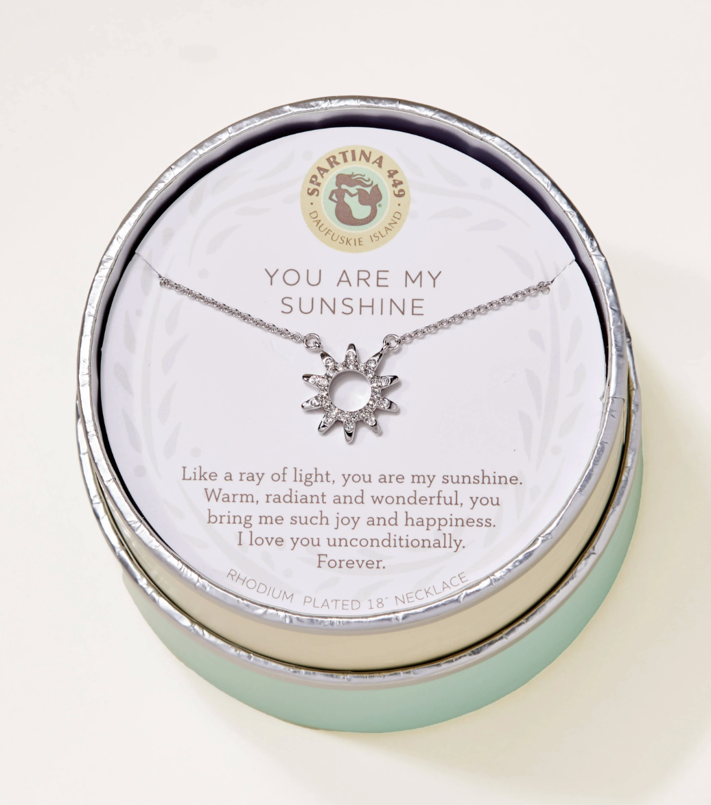 Wear our Sunshine Necklace as a reminder of unconditional love. Featuring a glass crystal studded sunshine charm, this special piece comes packaged inside a beautiful box with the message: "Like a ray of light, you are my sunshine. Warm, radiant and wonderful, you bring me such joy and happiness. I love you unconditionally. Forever."