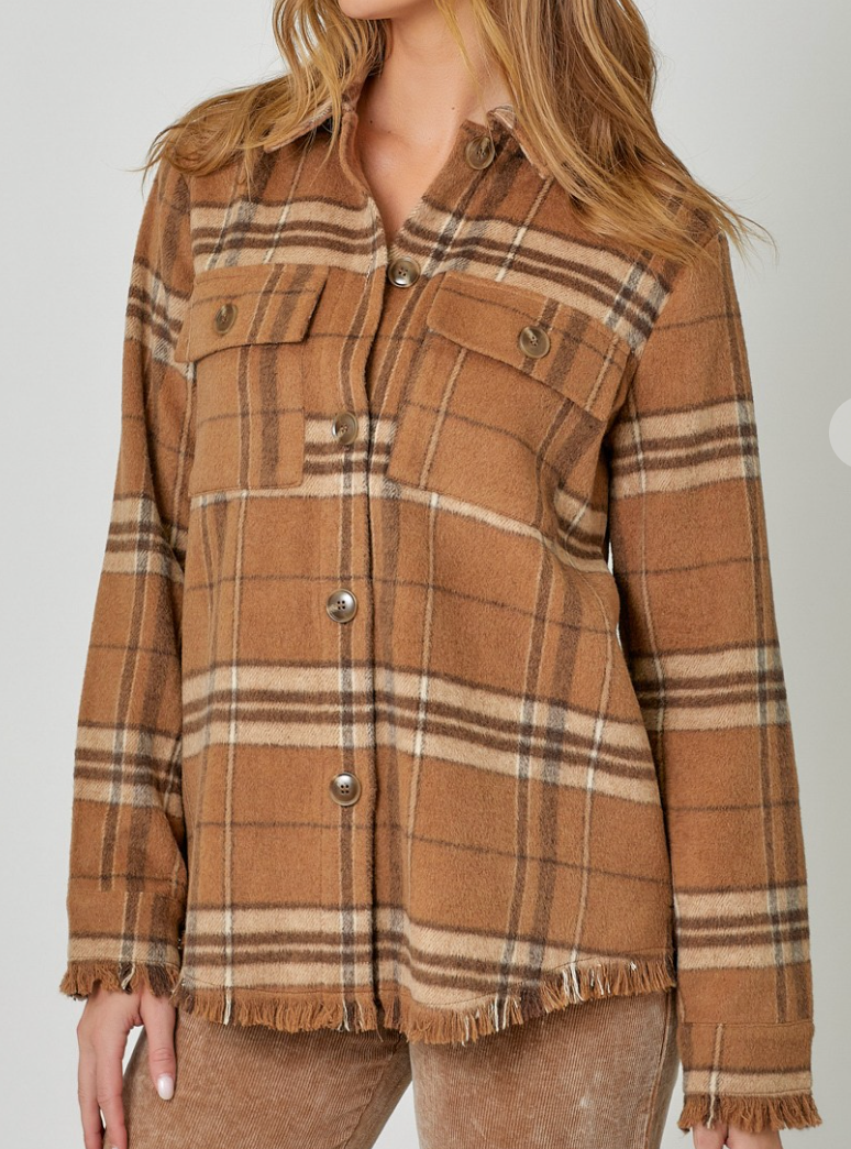 Wrap yourself in cozy fall vibes with this brown sugar plaid button-down jacket. Rich, warm tones meet playful fringe details for a look that's equal parts chic and fun. Layer it over your favorite sweater or wear it solo—either way, you'll radiate effortless autumn style. The perfect jacket for those crisp days when you want to feel polished without taking yourself too seriously. Your new seasonal obsession awaits!