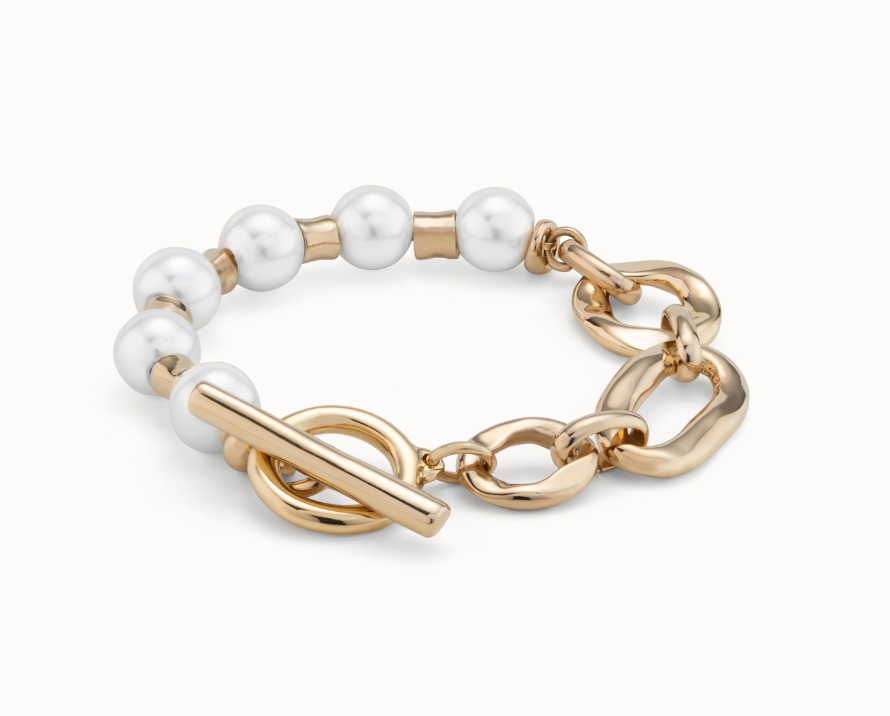 GOLD BRACELET WITH PEARLS AND LINKS JOYFUL||The Joyful collection combines different shapes and styles. This allows us to mix and play, to be creative and enjoy every step we take. Creativity embodied in jewelry such as this bracelet that combines pearls and links, dividing the bracelet into two completely different halves and creating an original design. ||This jewel is Made in Spain, 100% handcrafted, achieving a unique design finish.