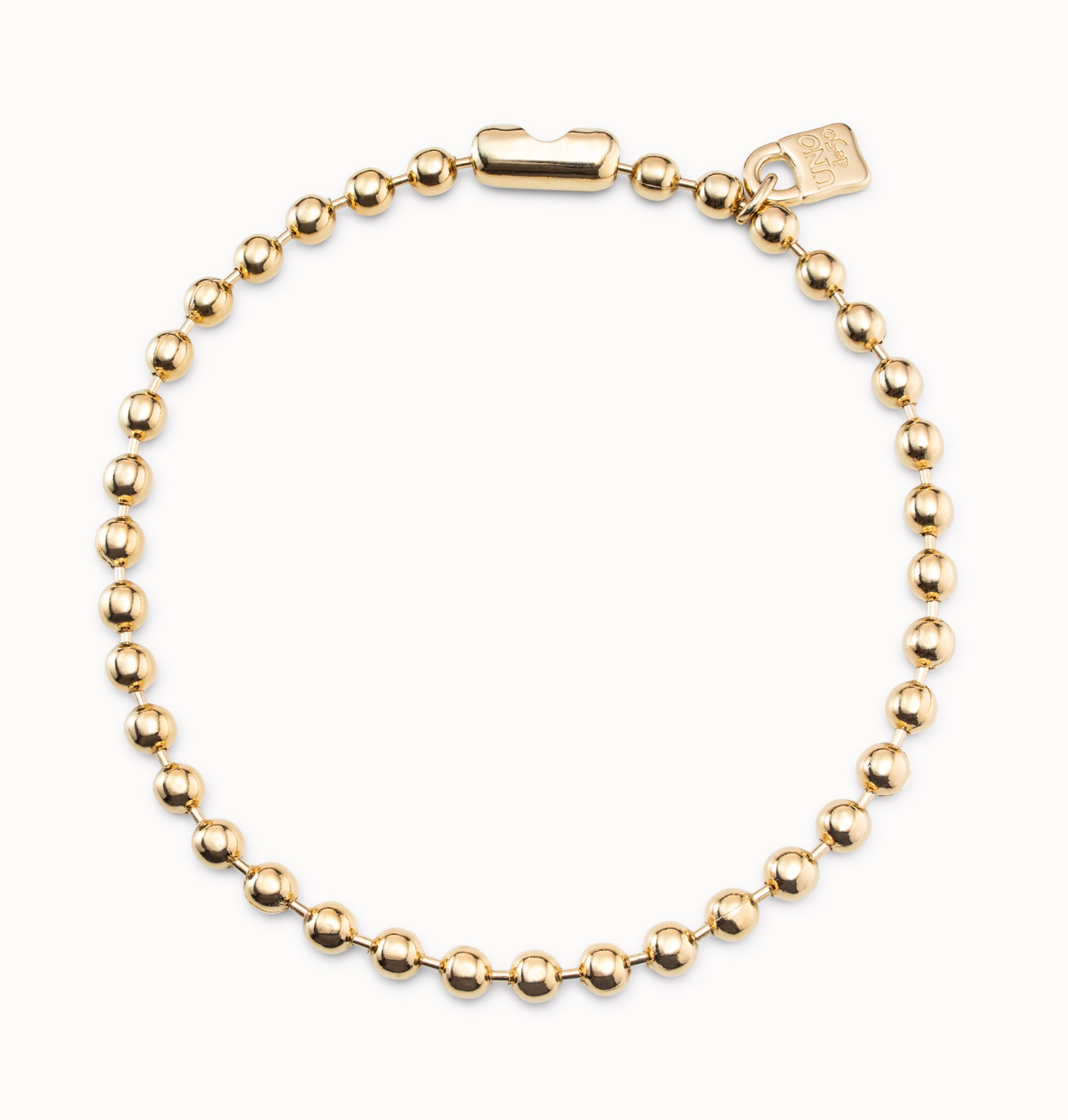 This modern unisex gold-plated necklace features a chain of large, spherical beads with our signature padlock. This piece is 100% handmade in Spain and features a unique and distinctive UNOde50 design. Wear this piece of jewelry and you’re sure to turn heads.