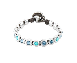 Original bracelet with brown leather base and button clasp, covered with silver-plated metal lentils and Swarovski crystals A jewel that you can wear daily and that will give a touch of color to all your looks A design by UNOde50, made in Spain and 100% handcrafted.