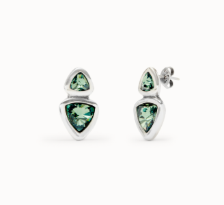 Sterling silver-plated earrings with two green crystals.Ser camaleónica is to adapt to everything with talent, while still being you. Is being versatile, resilient and always ready to reinvent yourself. Let your jewelry become a kaleidoscopic and change color. Nobody gets bored with you. Bring fun and dynamism to life. Like the fresh touch of the faceted crystal pieces that play with dimensions.