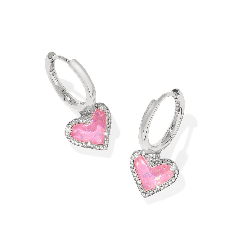 Ari Heart Silver Huggie Earrings in Pink Iridescent Glitter Glass - Kendra Scott