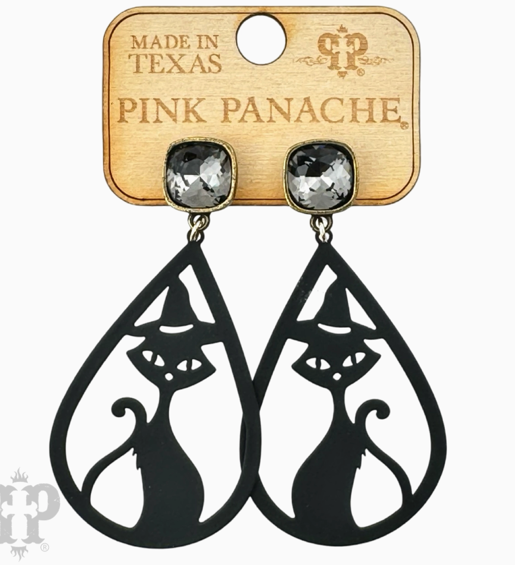 This earring has a black coated teardrop with a black cat in a witch hat. It hangs from a 10mm black diamond Austrian crystal in a custom made post setting. The earring measures approximately 2.5 inches in length.