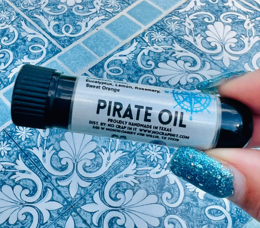 Pirate Oil - Feel good scent that to breathe clear and easy for immune and wellness support. Helps minimize the effects of seasonal threats. Ingredients: Cinnamon, Clove, Eucalyptus, Rosemary, Lemon, Sweet Orange How to Use: Place inhaler to each nostril and inhale deeply. Repeat as necessary. **Not safe to use during pregnancy**