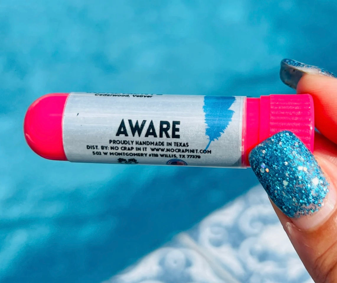 Aware - Brings clarity when trying to work or study. Ingredients: Cedarwood and Vetiver How to Use: Place inhaler to each nostril and inhale deeply. Use 3 times a day. **Not safe to use during pregnancy**